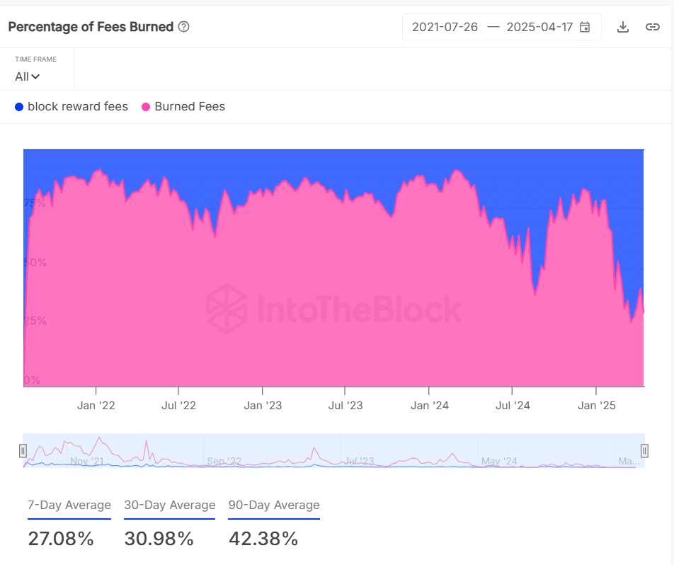 نسبة إثيريوم (ETH) المحترقة من رسوم المعاملات آخذة في الانخفاض بشكل ملحوظ. انخفض متوسط معدل الاحتراق على مدار 7 أيام إلى 27.08% فقط، وهو أقل بكثير من المتوسط على مدى 90 يومًا البالغ 42.38%. تُظهر هذه الانخفاضات أن مستوى النشاط على شبكة إيثريوم (Ethereum) يتراجع، مما يقلل من الضغط الانكماشي على الإيثير (Ether).