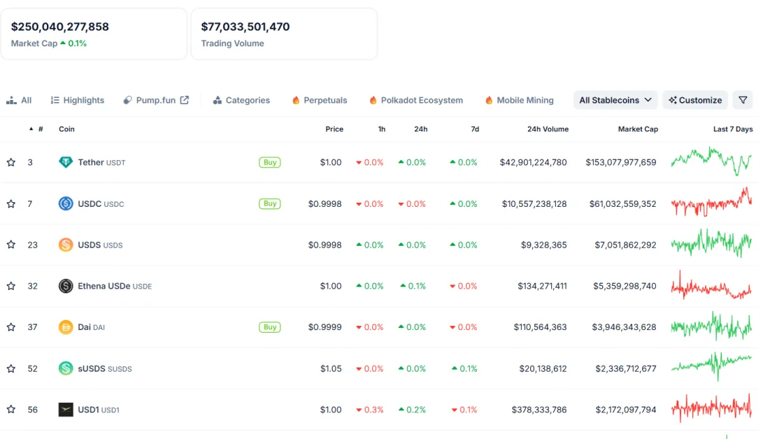 القيمة السوقية لعملات مستقرة تصل إلى رقم قياسي قدره 250 مليار دولار، مع تيثير عند 153 مليار دولار وUSDC عند 61 مليار دولار، مما يشير إلى زيادة الطلب في مجال العملات الرقمية