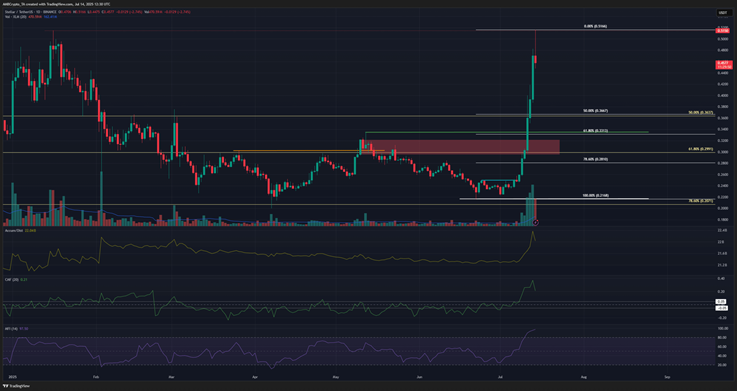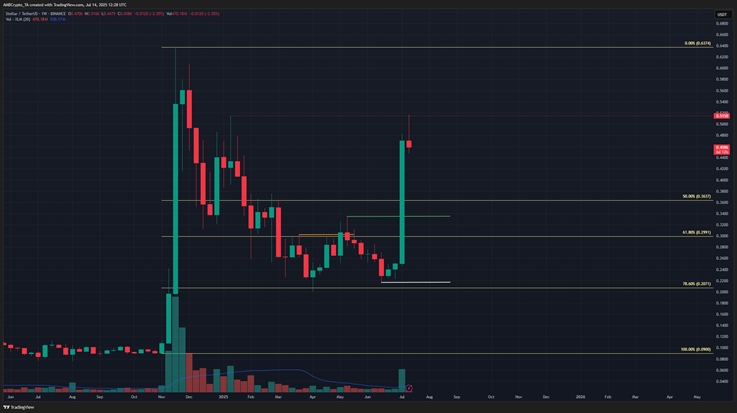 حتى إذا انخفض السعر بشكل كبير إلى 0.28 دولار، فإن الهيكل الصعودي على الرسم البياني الأسبوعي لا يزال سليماً. ومع ذلك، يبدو أن حدوث مثل هذا الانخفاض الكبير غير محتمل.