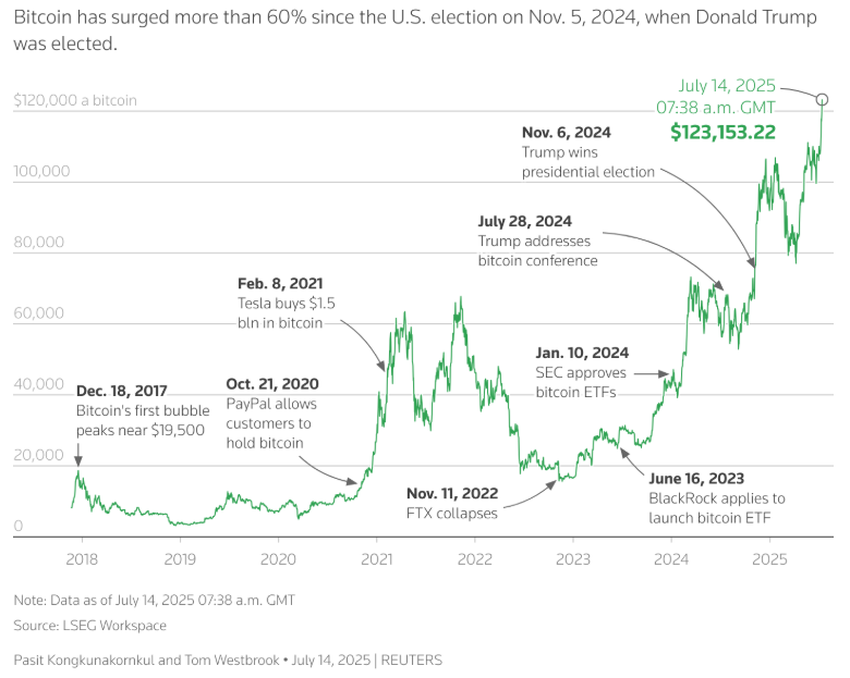 ارتفعت بيتكوين مؤخراً إلى 123000 دولار، مما يبرز سرعة تحول المشاعر في السوق نحو الأصول الرقمية - خاصة في ظل وجود تنظيم واضح وتوافق القوى الاقتصادية الكلية. تعتبر هذه الزيادة جزءًا من الاتجاه العام للارتفاع، حيث سجلت بيتكوين ارتفاعات جديدة في الأسابيع القليلة الماضية نتيجة لتفاعل العوامل السياسية والاقتصادية والبنيوية. وقد ساهمت التقدم التشريعي في واشنطن، وضعف الدولار، وزيادة المخاوف من التضخم، وتغير وجهة نظر المستثمرين تجاه أدوات تخزين القيمة الأخرى في إعادة إحياء جاذبية بيتكوين.
