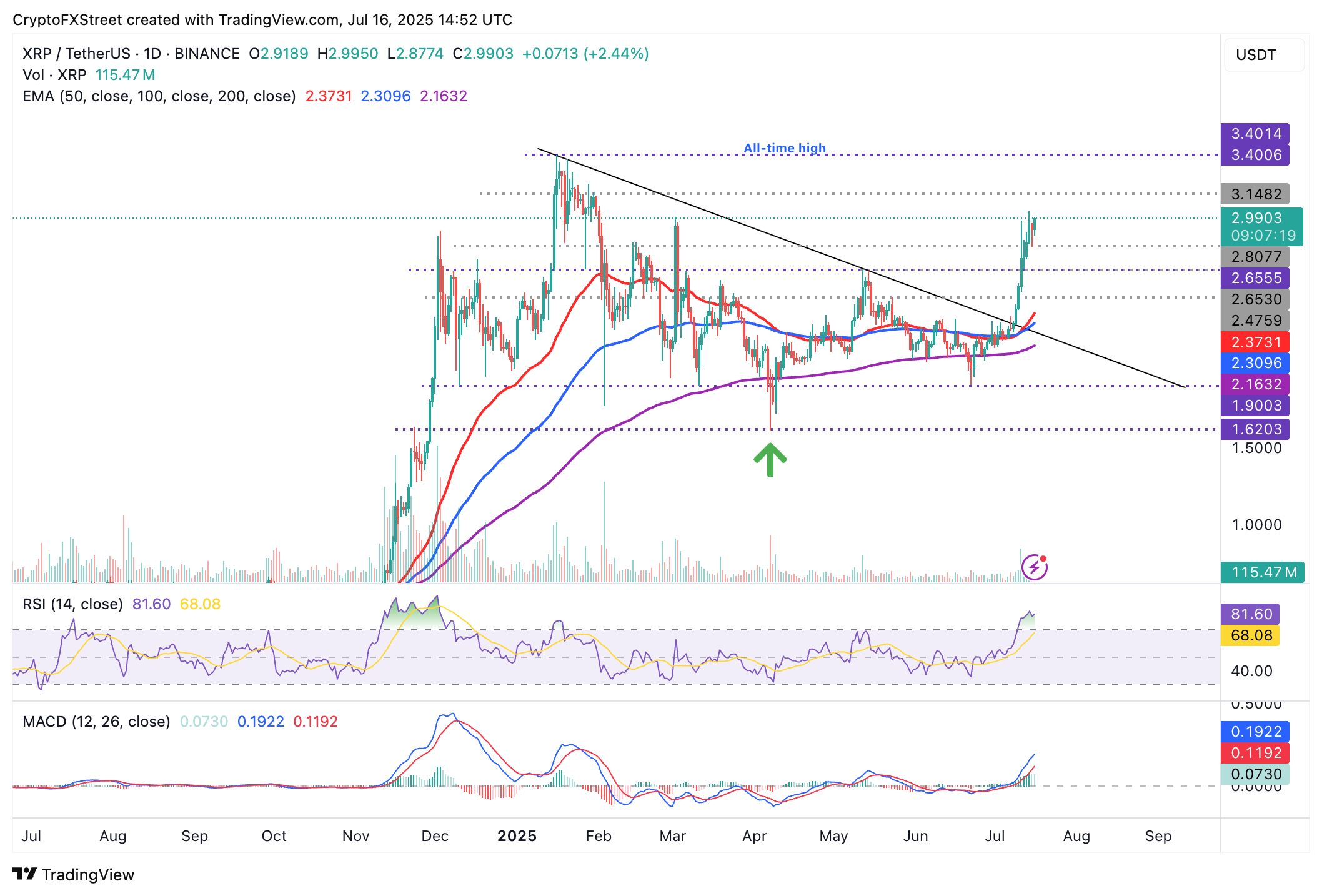 على الرغم من ذلك، نظرًا لأن مؤشر القوة النسبية (RSI) في حالة شراء مفرط عند 81، يُنصح بالتعامل بحذر. عادةً ما تشير قراءة RSI التي تزيد عن 70 إلى أن السوق مشبعة، وقد يحدث انعكاس في الاتجاه. لذلك، إذا انخفض RSI إلى أقل من 70، فقد يسترد سعر XRP الزيادة عند مستوى الدعم المتوسط المتحرك لمدة 50 يومًا البالغ 2.37 دولار.