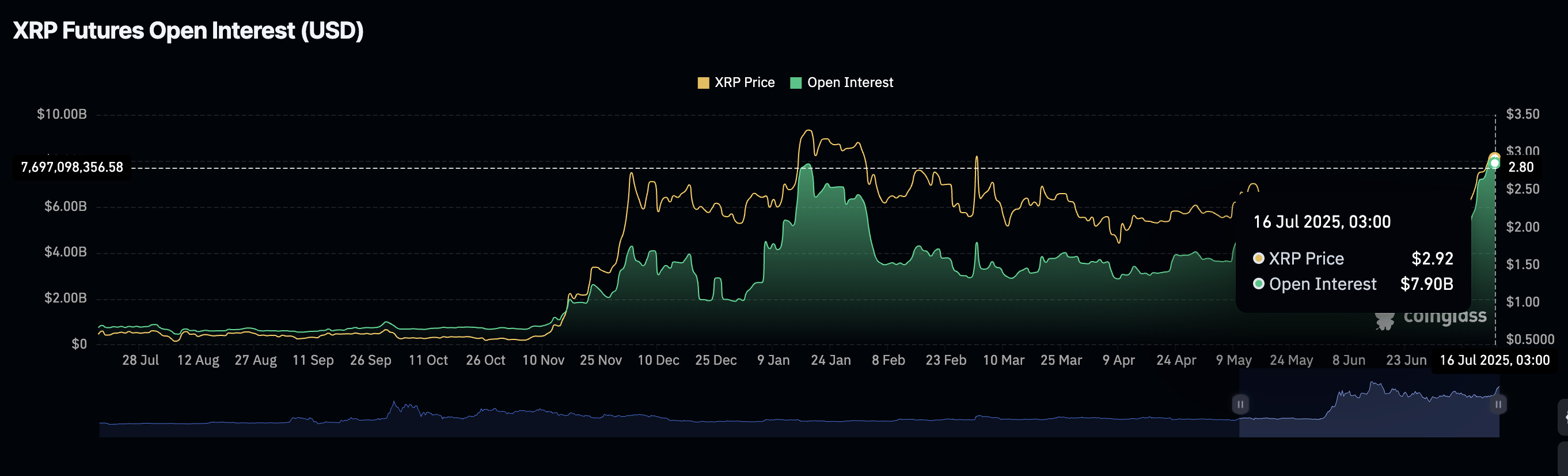 في الوقت نفسه، ظل اهتمام المستثمرين بـ XRP ثابتًا خلال الأسابيع القليلة الماضية، حيث زادت العقود الآجلة من العقود المفتوحة (OI) من 3.54 مليار دولار في 23 يونيو إلى 7.9 مليار دولار عند كتابة هذه المقالة.