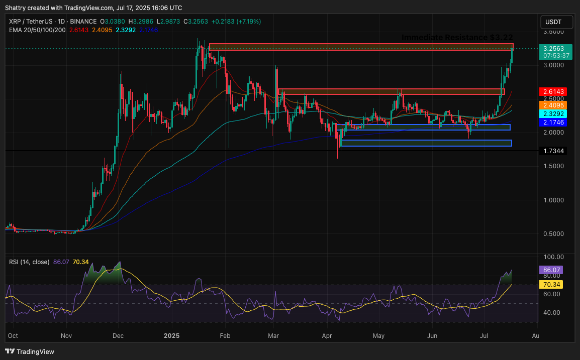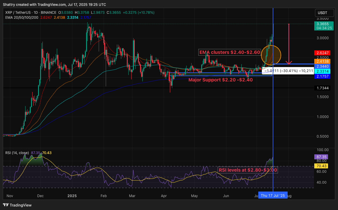 أنتج RSI المتطرف عند 86.07 نتيجة ثنائية، حيث يمكن أن يحقق XRP إما اختراقًا حاسمًا فوق 3.30 دولار، مع هدف يتجاوز 4.00 دولار، أو يمر بتصحيح صحي لإعادة ضبط المؤشرات الفنية.