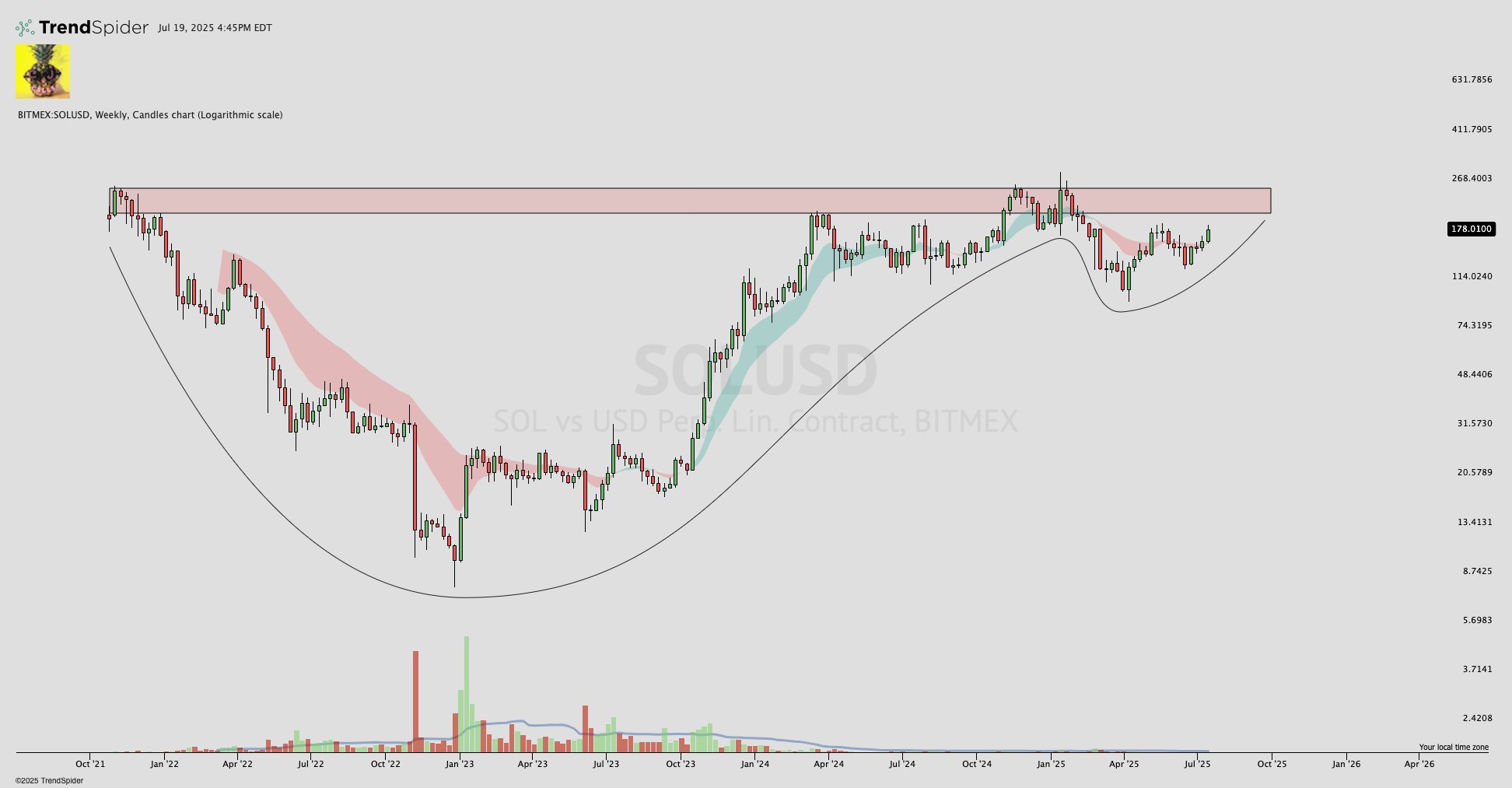 يوضح الرسم البياني الأسبوعي لـ SOL نمط كوب ومقبض ضخم يتشكل على مدى سنوات، مما يمثل واحدًا من أكثر الأنماط استمرارًا التي تدل على الاتجاه الصعودي في التحليل الفني.