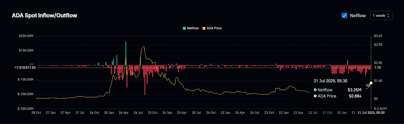 تشير إشارات الإنذار المبكر إلى صافي التدفق الداخل من البورصة، بعد أن شهدت ADA تدفقات خارجة لعدة أسابيع (وهو ما يعد عادة إشارة إيجابية للمستثمرين على المدى الطويل للاحتفاظ بمراكزهم)، في 21 يوليو، عاد نحو 3.35 مليون دولار من ADA إلى البورصة.