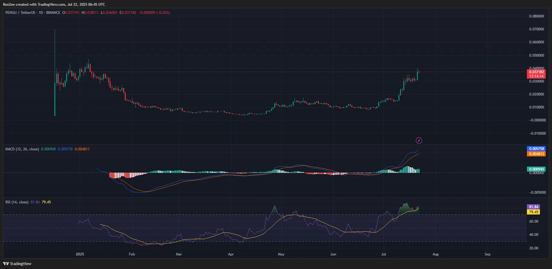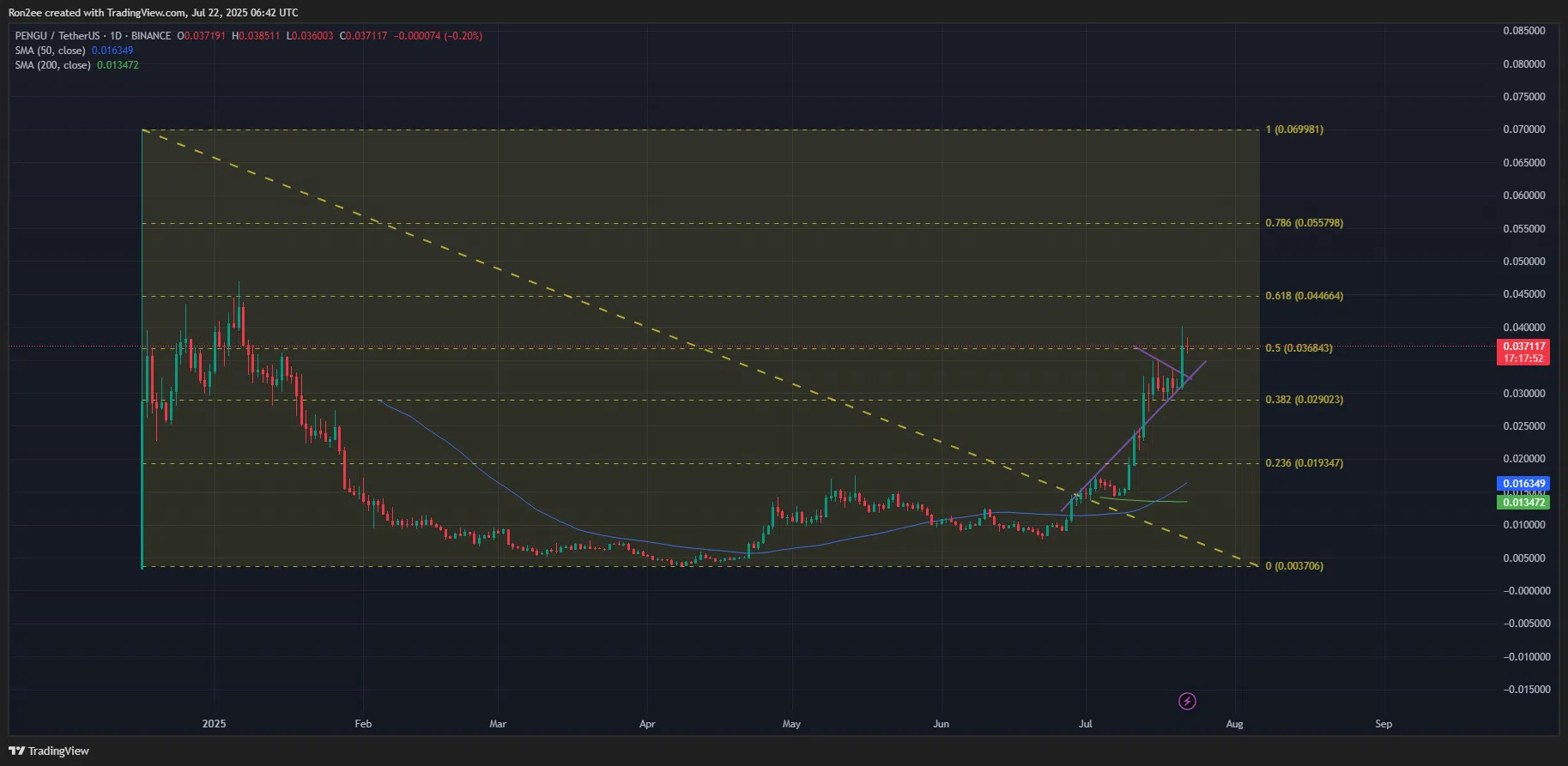 على الرسم البياني اليومي، قد تجاوز PENGU سابقاً نموذج الكوب والعروة، مما أدى إلى ارتفاع كبير بنسبة 75%، ليصل إلى سعر الهدف 0.031 دولار، كما توقعنا.