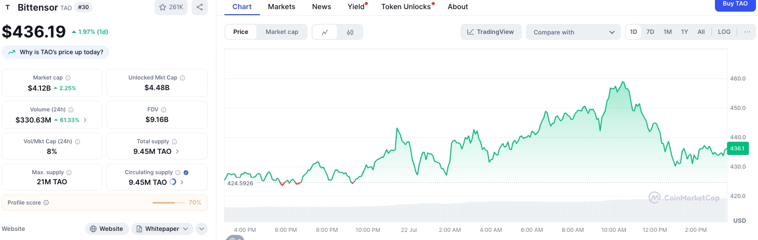 اليوم (22) في منتصف نهار آسيا، سجل TAO سعر 435.86 دولار، بزيادة يومية تقارب 2%.