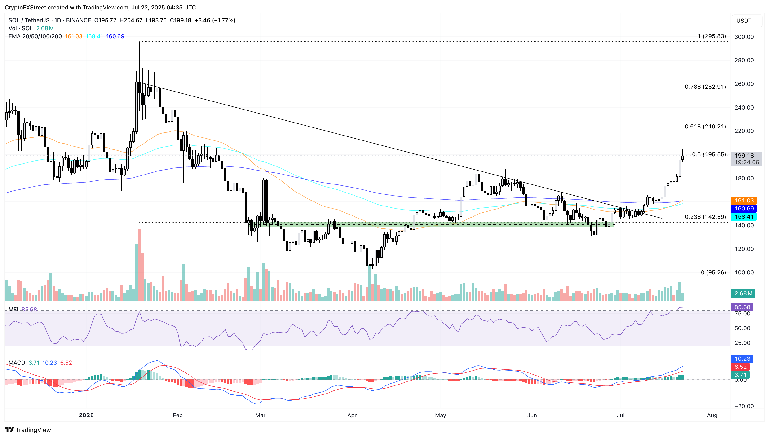 SOL ارتفعت بنسبة تقارب 2% منذ يوم الثلاثاء، مستمرة في زيادة بنسبة 7% يوم الاثنين. وصلت اتجاهاتها الصاعدة إلى أعلى مستوى لها خلال ستة أشهر، متجاوزة مستوى 50% من فيبوناتشي البالغ 195 دولار، والذي انخفض من أعلى مستوى له عند 295 دولار في 19 يناير إلى أدنى مستوى له عند 95 دولار في 7 أبريل.