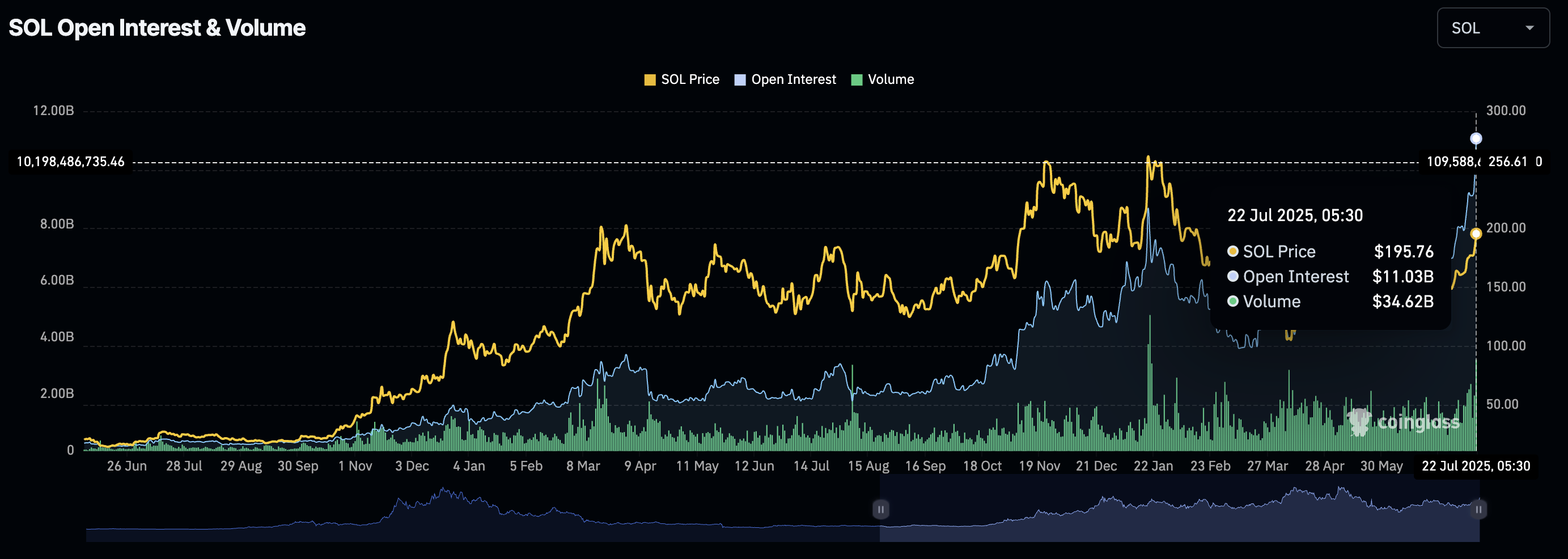 تظهر بيانات Coinglass أن العقود غير المغلقة لـ SOL (OI) سجلت أعلى مستوى تاريخي عند 11.03 مليار دولار، متجاوزة 9.52 مليار دولار يوم الاثنين.