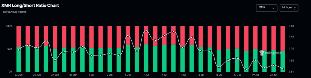 تُظهر بيانات Coinglass أن نسبة الشراء والبيع لـ XMR يوم الثلاثاء كانت 0.82، وهو أدنى مستوى لها منذ أكثر من شهر. النسبة أقل من 1، مما يدل على أن المشاعر السلبية في السوق مرتفعة، حيث يراهن المزيد من المتداولين على انخفاض سعر عملة مونيرو.