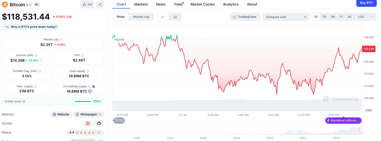 بيتكوين (BTC) اليوم (22) في الصباح الأوروبي تسجل فوق 118,500 دولار، من مستوى الدعم الانتعاش. سولانا (SOL) تتبع اتجاه الانتعاش، تسجل حوالي 199 دولار. القيمة السوقية للأصول الرقمية انخفضت بنسبة 1.4% خلال الـ 24 ساعة الماضية، لتصل إلى 3.9 تريليون دولار. في إغلاق يوم أمس، انتشرت ضغوط بيتكوين في جميع أنحاء السوق، مما أدى إلى توقف ارتفاع العديد من العملات البديلة.