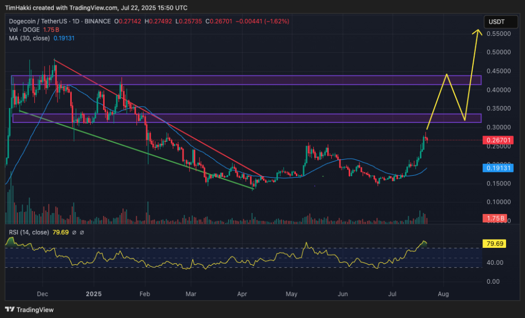DOGE حاليا سعر التداول هو 0.2669 دولار، وقد ارتفع بنسبة 40% في آخر سبعة أيام، وارتفع بنسبة 80% في الثلاثين عامًا الماضية. تشير قراءة RSI إلى 80، مما يدل على أن تصحيحًا قصير الأجل قادم، وسيستفيد المتداولون من الفرصة لتحقيق الأرباح. لكن لا داعي للقلق، سيؤدي هذا التصحيح إلى دمج السعر قبل الجولة التالية من الارتفاع.