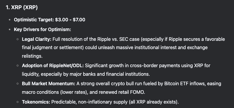 ومع ذلك، فإن منافس DeepSeek، ChatGPT، يعتقد أنه بناءً على أداء XRP حتى الآن هذا العام، فإن سعره من السهل أن يصل إلى ثلاثة أضعاف توقعات DeepSeek. إن مثل هذا الهدف العالي يتطلب محفزًا قويًا، مثل إصلاحات تنظيمية أمريكية مواتية. تحت قيادة إدارة ترامب، قد تؤدي التشريعات الأكثر وضوحًا إلى سوق صاعدة، ربما تتجاوز حتى “حمى البحث عن الذهب” في عام 2021.