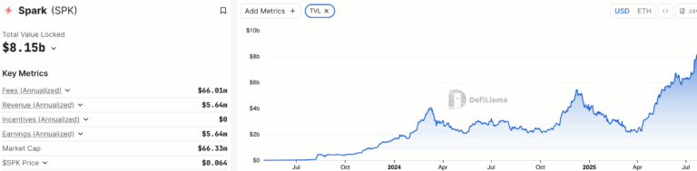 في هذه الاختراق، تظهر بيانات DeFiLlama أن القيمة الإجمالية المقفلة (TVL) لـ Spark قد ارتفعت إلى 81.5 مليار دولار.