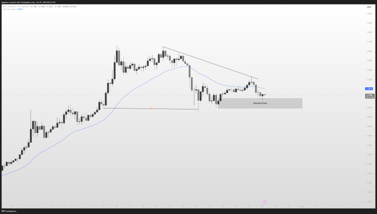 سعر XRP يقوم حاليًا بإعادة اختبار منطقة الطلب الرئيسية بين 3.00 دولار و 3.14 دولار. على الرغم من أن هذه المنطقة قد أثارت ارتدادًا قويًا سابقًا، إلا أن الزخم هذه المرة أضعف. كيان K صغير، وظلاله خفيفة، مما يدل على تردد السوق، وحجم التداول يتناقص.