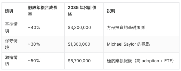 السيناريو الأساسي - حوالي 40% CAGR: تتوقع ARK Invest (استثمار آرك) أن يكون معدل النمو السنوي المركب لبيتكوين حوالي 40% بحلول عام 2030، استنادًا إلى معدل الاعتماد العالمي ونشاط الشبكة. إذا استمر هذا المعدل حتى عام 2035، فإن مضاعف النمو سيكون: (1 + 0.40)^10 ≈ 28 مرة.