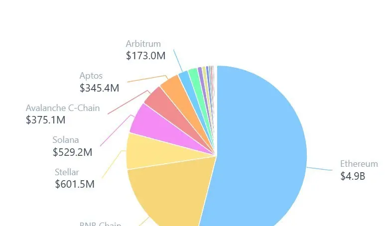 لا تزال شبكة إيثيريوم هي الأكثر سيطرة في مجال سندات الخزانة الأمريكية المرمّزة. وأظهرت بيانات RWA.xyz أنه حتى يوم الاثنين، تجاوزت قيمة سندات الخزانة الأمريكية المرمّزة على إيثيريوم 4.9 مليار دولار.