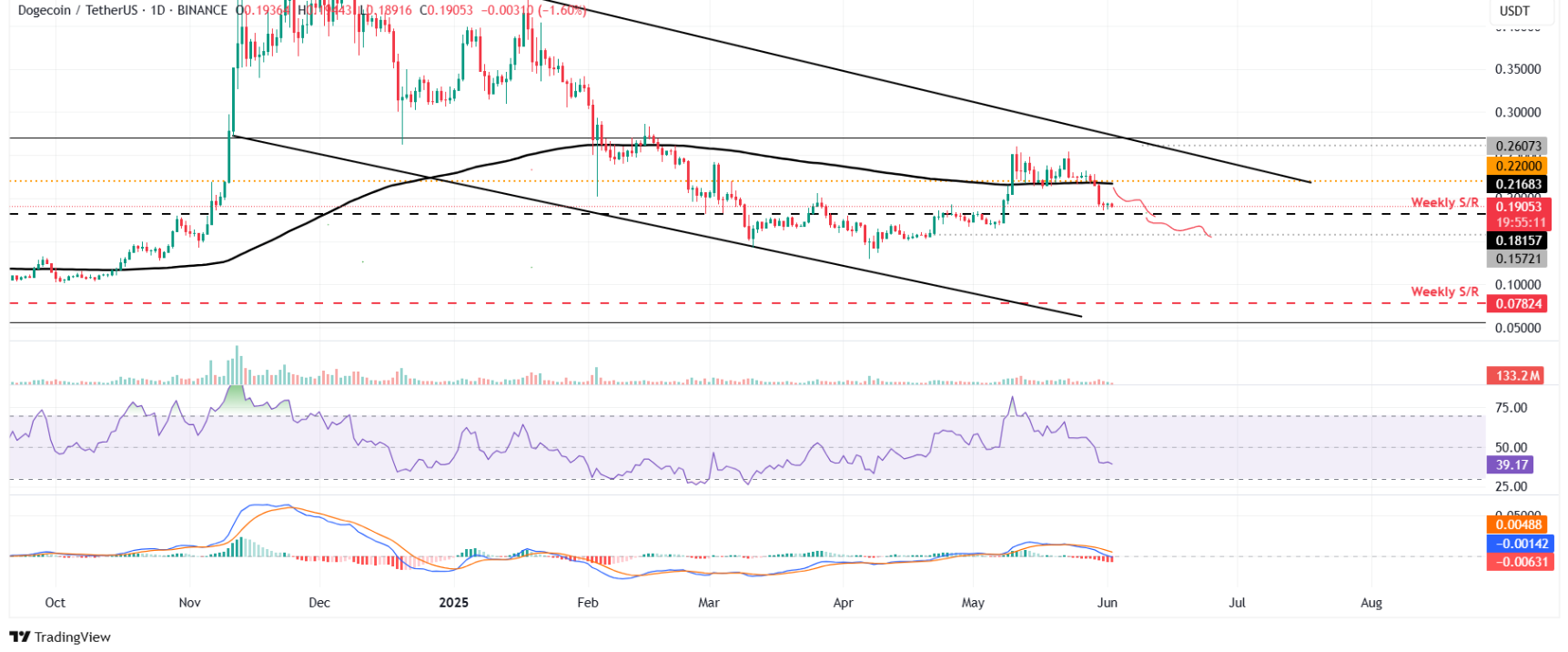 ! DOGE/USDT Tageschart | Quelle: TradingViewAuch die technischen Indikatoren sprechen nun für das negative Szenario: Der tägliche RSI liegt bei 39 – deutlich unter dem Neutral von 50 – was die zunehmende Verkaufsdynamik widerspiegelt. Gleichzeitig schien sich der MACD gerade zu kreuzen, was ein Verkaufssignal und die Möglichkeit einer kurzfristigen weiteren Anpassung sendet.
