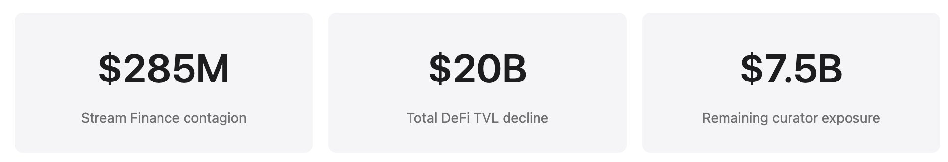 Según el grupo DeFi Yields and More (YAM), la exposición directa a deuda vinculada a Stream alcanzó 285 millones de dólares en todo el ecosistema. Entre las exposiciones, TelosC tenía 123,64 millones en préstamos garantizados por activos de Stream (la mayor exposición individual), Elixir Network prestó 68 millones a través de bóvedas privadas Morpho (65 % del respaldo de deUSD), MEV Capital con 25,42 millones incluyendo unos 650 000 dólares de deuda incobrable por oráculos que congelaron el precio de xUSD en 1,26 dólares mientras el mercado lo hundía a 0,23 dólares, Varlamore con 19,17 millones, Re7 Labs con 14,65 millones en una bóveda y 12,75 millones en otra, Enclabs, Mithras, TiD e Invariant Group con posiciones menores. Euler afrontó unos 137 millones en deuda incobrable. Más de 160 millones quedaron congelados en varios protocolos. Los investigadores advirtieron que esta lista no era exhaustiva, alertando de “probables más stables/bóvedas afectadas” mientras se desconocía el alcance total semanas después del colapso.