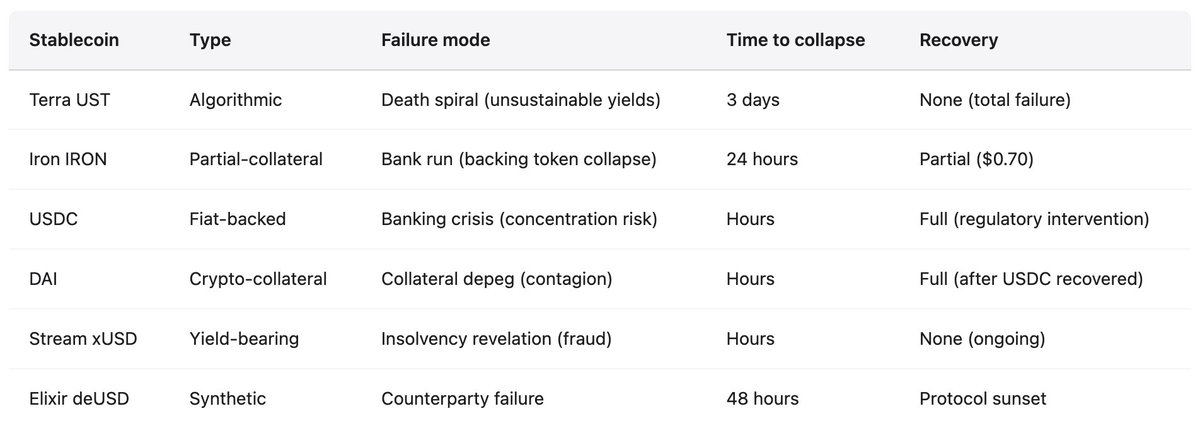 Todos los casos muestran patrones comunes de fallo. Rentabilidades insostenibles: Terra (19,5 %), Iron (1700 % APR), Stream (18 %) ofrecieron retornos desvinculados de ingresos reales. Dependencias circulares: UST-LUNA, IRON-TITAN, xUSD-deUSD presentaron esquemas de colapso mutuo. Opacidad: Terra ocultó los costes de Anchor, Stream ocultó el 70 % de operaciones off-chain, Tether ha sido cuestionada por sus reservas. Colateralización parcial o respaldo autoemitido: depender de tokens volátiles o propios genera espirales de muerte bajo presión, ya que el valor colateral cae justo cuando debería sostener el sistema. Manipulación de oráculos: Feeds congelados o manipulados impiden liquidaciones correctas y acumulan deuda incobrable hasta la insolvencia. El mensaje es claro: los stables no son estables. Lo parecen hasta que dejan de serlo, y el cambio ocurre en cuestión de horas.