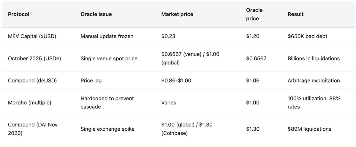 Los protocolos afrontan un dilema irresoluble. Usar precios en tiempo real implica riesgos de manipulación y liquidaciones en cascada durante la volatilidad, como demostró octubre de 2025 a gran escala. Usar precios retrasados o TWAP impide reaccionar ante insolvencia real y acumula deuda incobrable, como Stream Finance demostró cuando los oráculos marcaban 1,26 dólares y el precio era 0,23, generando 650 000 dólares de deuda solo en MEV Capital. Las actualizaciones manuales introducen centralización, discrecionalidad y la posibilidad de ocultar insolvencia congelando el oráculo. Los tres métodos han destruido cientos o miles de millones.