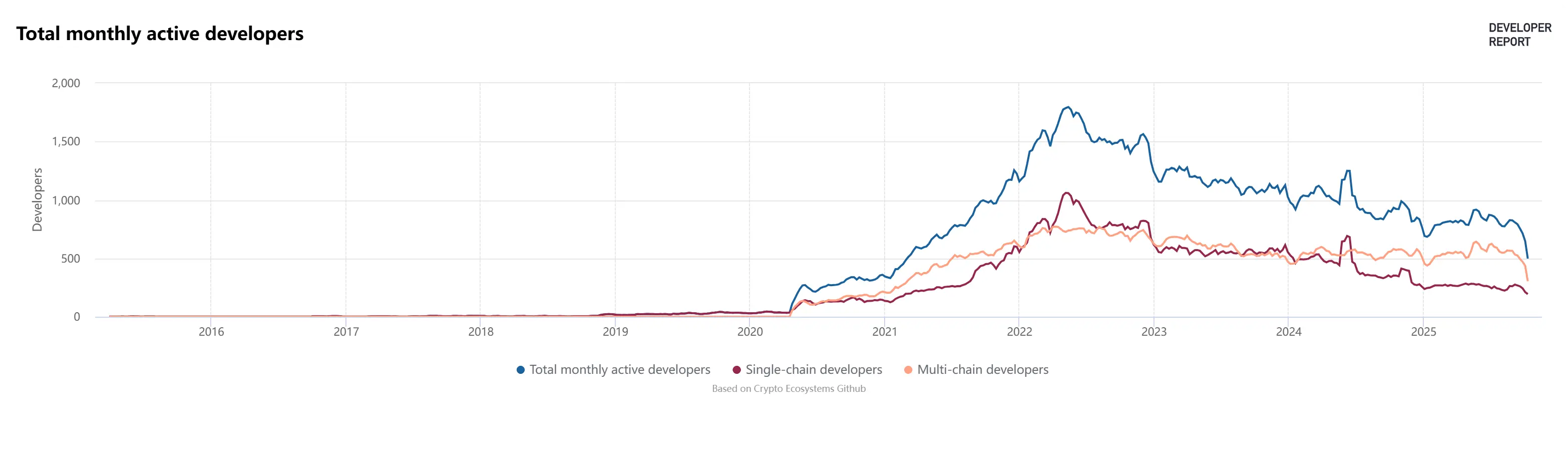 Al mismo tiempo, en el ecosistema de desarrolladores, NEAR necesita competir con otras cadenas públicas como Ethereum, BSC, Solana y Avalanche por proyectos y recursos de calidad. En los últimos dos años, el número de desarrolladores activos mensuales de NEAR ha estado en una tendencia a la baja, y en los últimos meses, ha habido una salida masiva de desarrolladores de cadenas cruzadas, acercándose a la franja baja del último año, y se está orientando hacia una “contracción y reestructuración”.