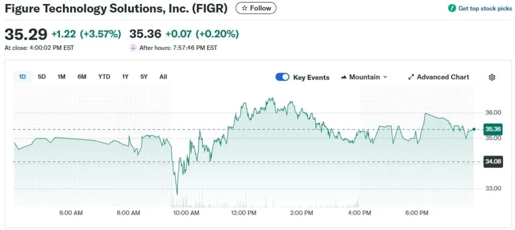Fuente: Yahoo Finance. Según los expertos, el principal impulsor fueron los resultados financieros preliminares de Figure por el cuarto trimestre de 2025. La compañía espera ingresos en el rango de $158-162 millones, por encima del pronóstico de Wall Street de $154 millones. La ganancia antes de intereses, impuestos, depreciaciones y amortizaciones (EBITDA) se estima en $80-83 millones.