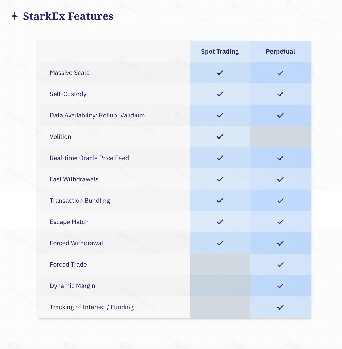 - Disponibilité des données: StarkEx propose des options pour la disponibilité des données. Avec la disponibilité des données on-chain, toutes les données de transaction sont publiées sur Ethereum, garantissant qu'elles peuvent toujours être reconstruites si nécessaire. La disponibilité des données hors chaîne réduit les coûts mais nécessite de faire confiance au comité de disponibilité des données.