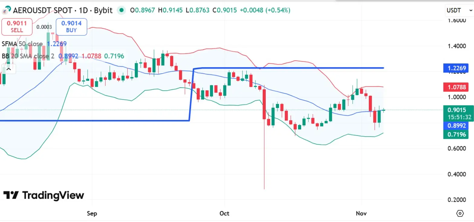 Au moment de la rédaction, AERO est échangé autour de 0,901 USD, enregistrant une augmentation de 10,43 % au cours des 24 dernières heures – un retour impressionnant après une série de jours de baisse qui a duré toute une semaine.