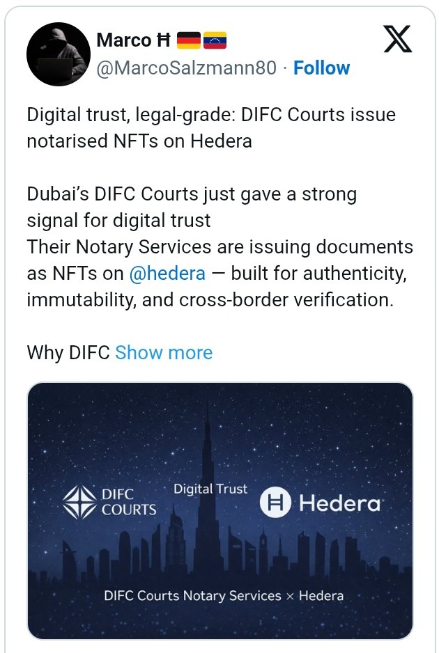 C’est ça, la vraie adoption. Pas de hype—une infrastructure : environnements réglementés, processus juridiques et rails de confiance vérifiables passant au numérique. Si plus de tribunaux ou de cadres de notariat suivent ce modèle, nous tenons un plan d’ensemble évolutif pour l’identité numérique et l’intégrité des documents, alimenté par Hedera.
