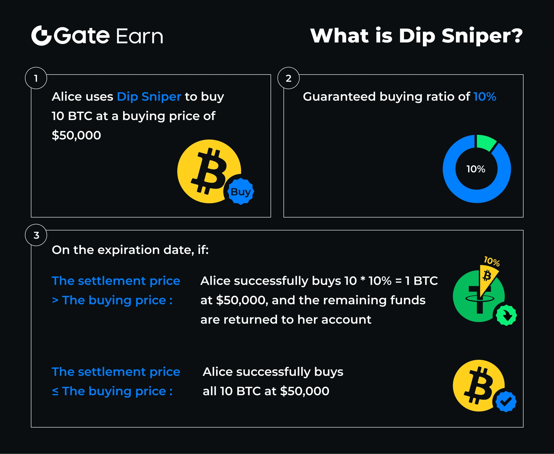 - Alice sử dụng Dip Sniper để mua 10 BTC với giá mua $50.000, với tỷ lệ mua đảm bảo là 10%.