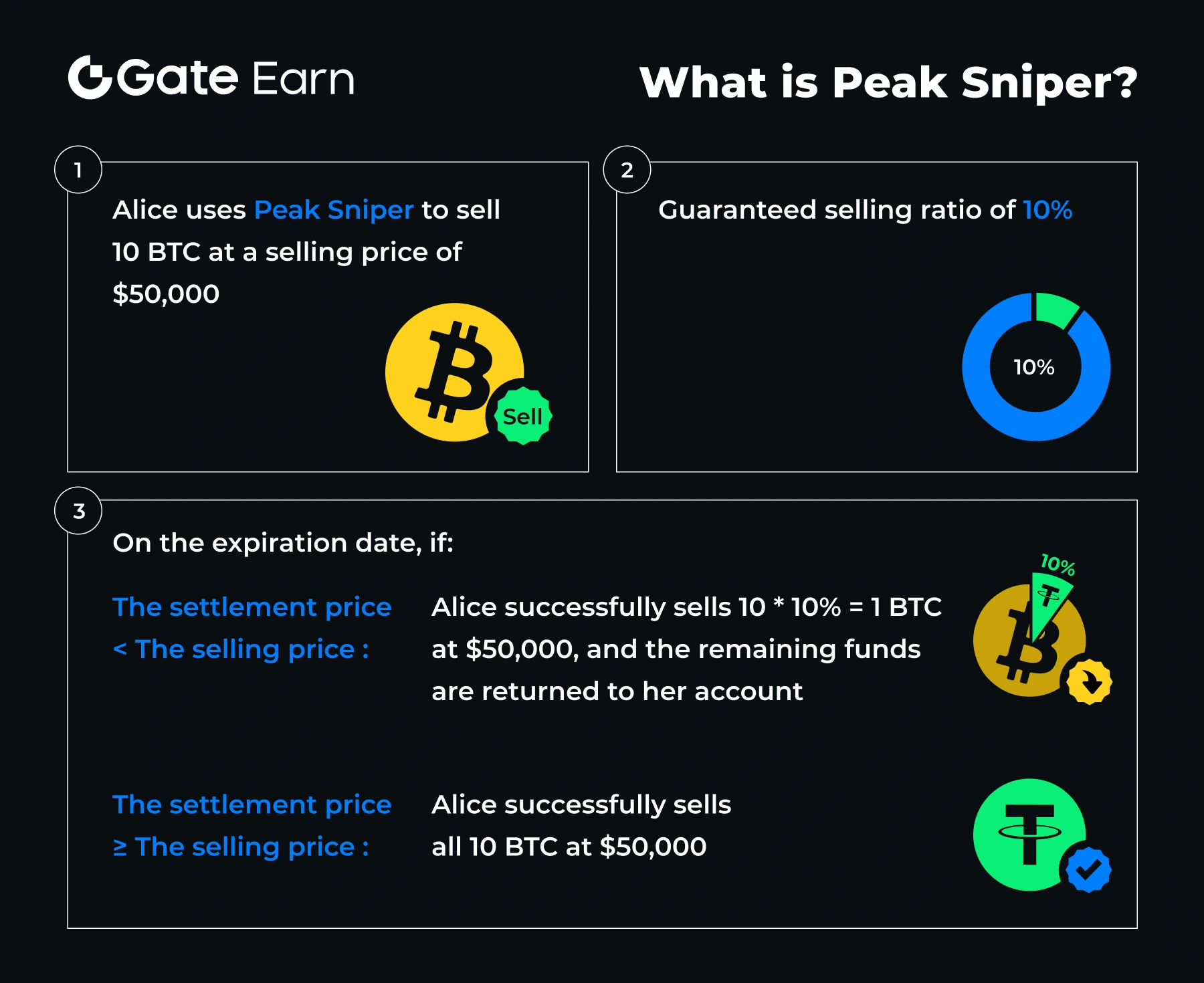 - Alice sử dụng Peak Sniper để bán 10 BTC với giá bán $50.000, với tỷ lệ bán đảm bảo là 10%.