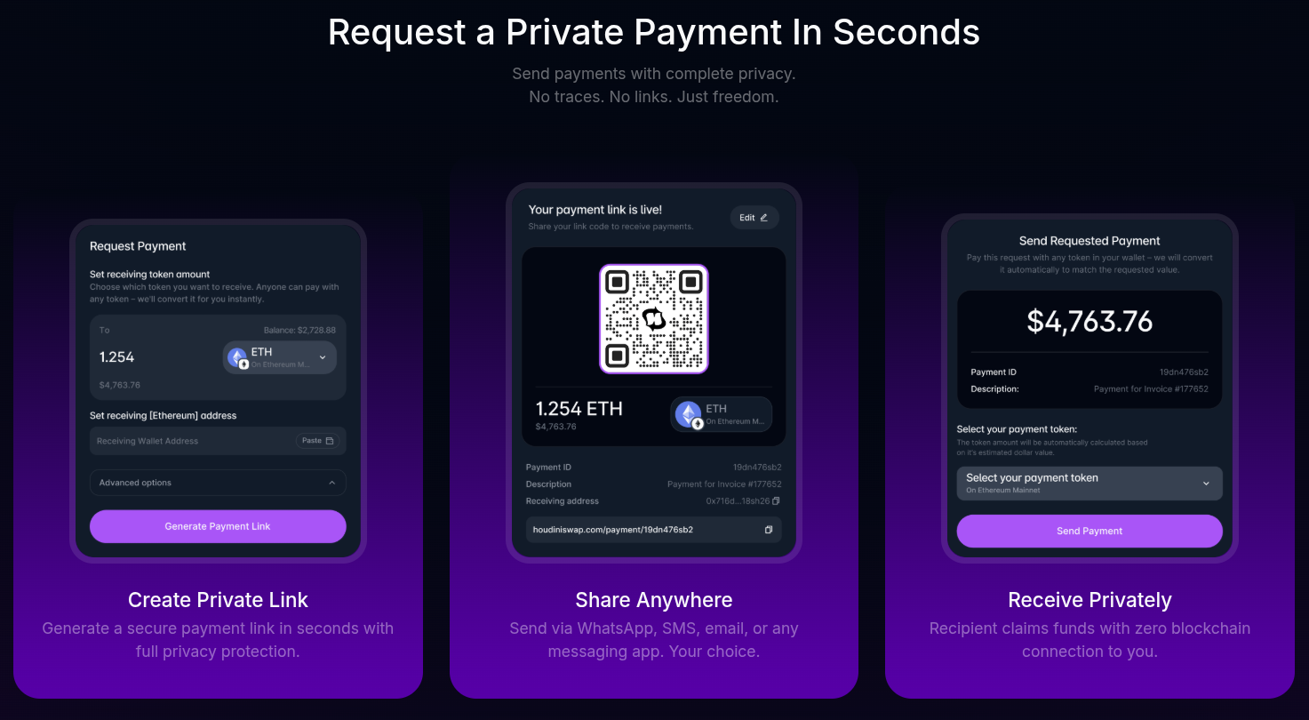 Penjelasan UI Houdini Pay. Sumber: HoudiniSwapTerkait: Buterin menyumbang untuk 2 proyek yang mendorong 'langkah selanjutnya' dari privasi digital