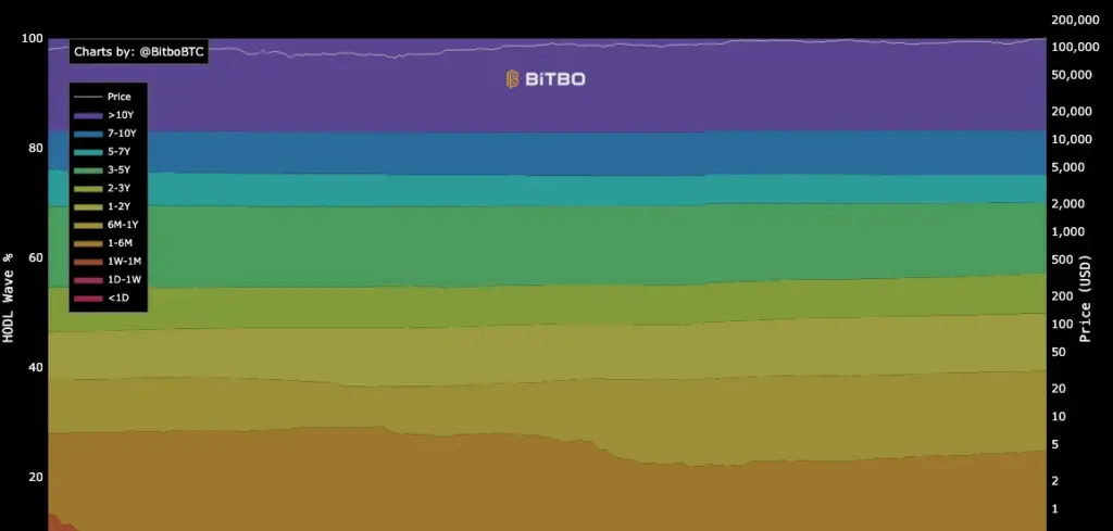 Pembagian HODL Waves terbaru menunjukkan 7--10 tahun mendekati 8%, 5--7 tahun mendekati 5%, 3--5 tahun mendekati 13%, 2--3 tahun mendekati 7%, 1--2 tahun mendekati 11.5%, 6--12 bulan mendekati 13%, 3--6 bulan mendekati 7.5%, 1--3 bulan mendekati 9.5%, dan di bawah satu bulan mendekati 5%.
