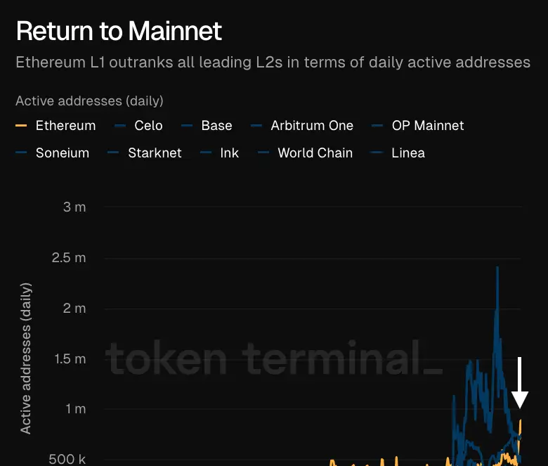 Token Terminal mengatakan bahwa telah terjadi “kembalinya ke mainnet,” dengan jumlah alamat aktif harian di Ethereum melampaui semua layer-2 terkemuka.