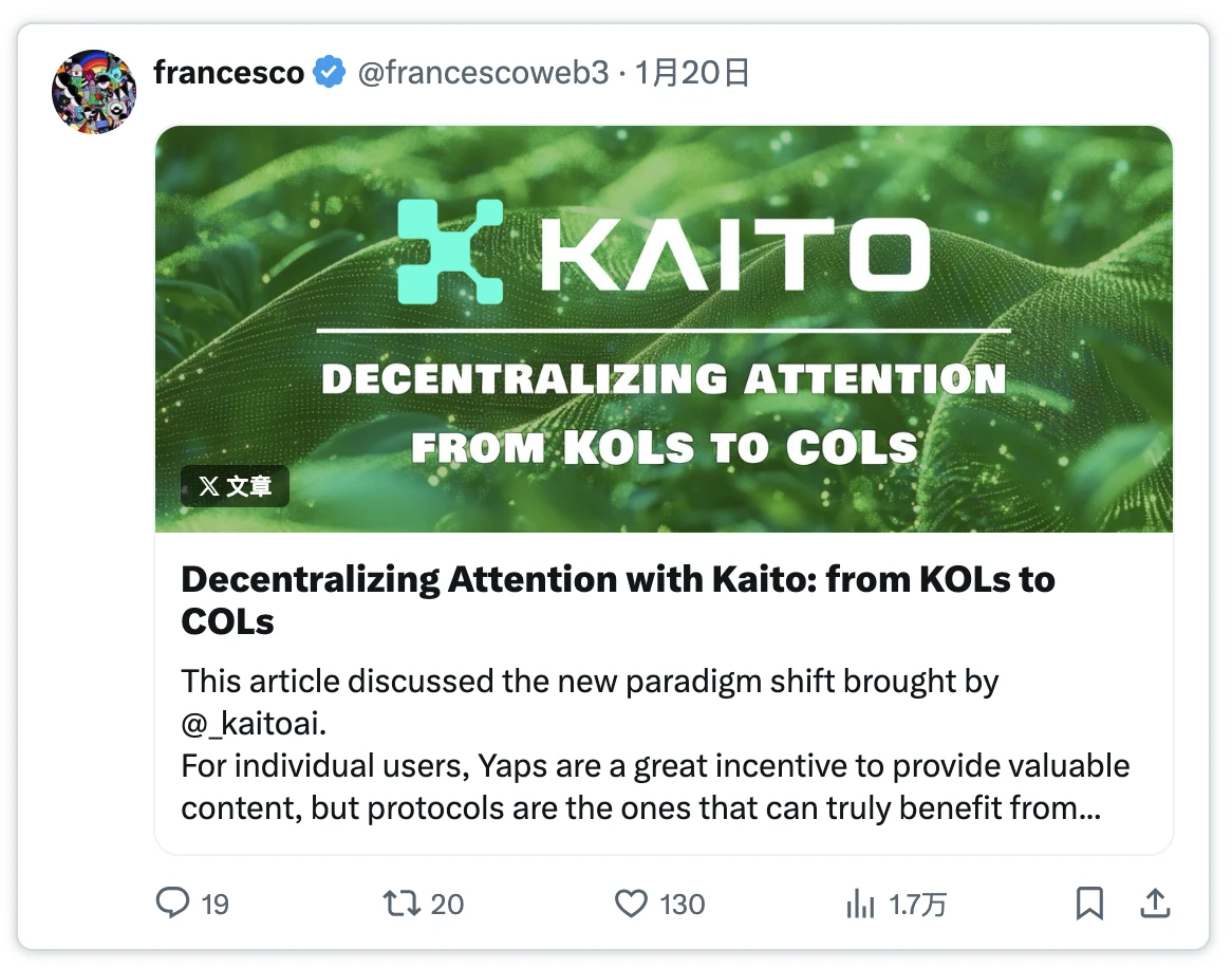 Kaitoを通じて、プロトコルはマーケティングやKOL仲介をスキップし、コミュニティの貢献に基づいて報酬を行うことができます。