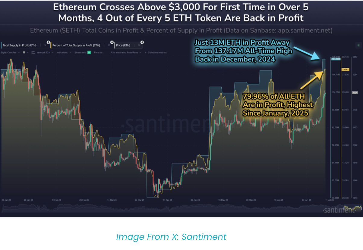 オンチェーン指標は、イーサリアムの現在の強さをさらに確認しました。オンチェーン分析プラットフォームのSantimentが提供するデータによると、先週の金曜日以来、イーサリアムの価格は$3,000近くで変動し、この水準を何度も突破しました。この過程で、総供給量の79.96%のイーサリアム(ETH)が利益状態に入りました。この割合は2025年1月以来の最高値です。