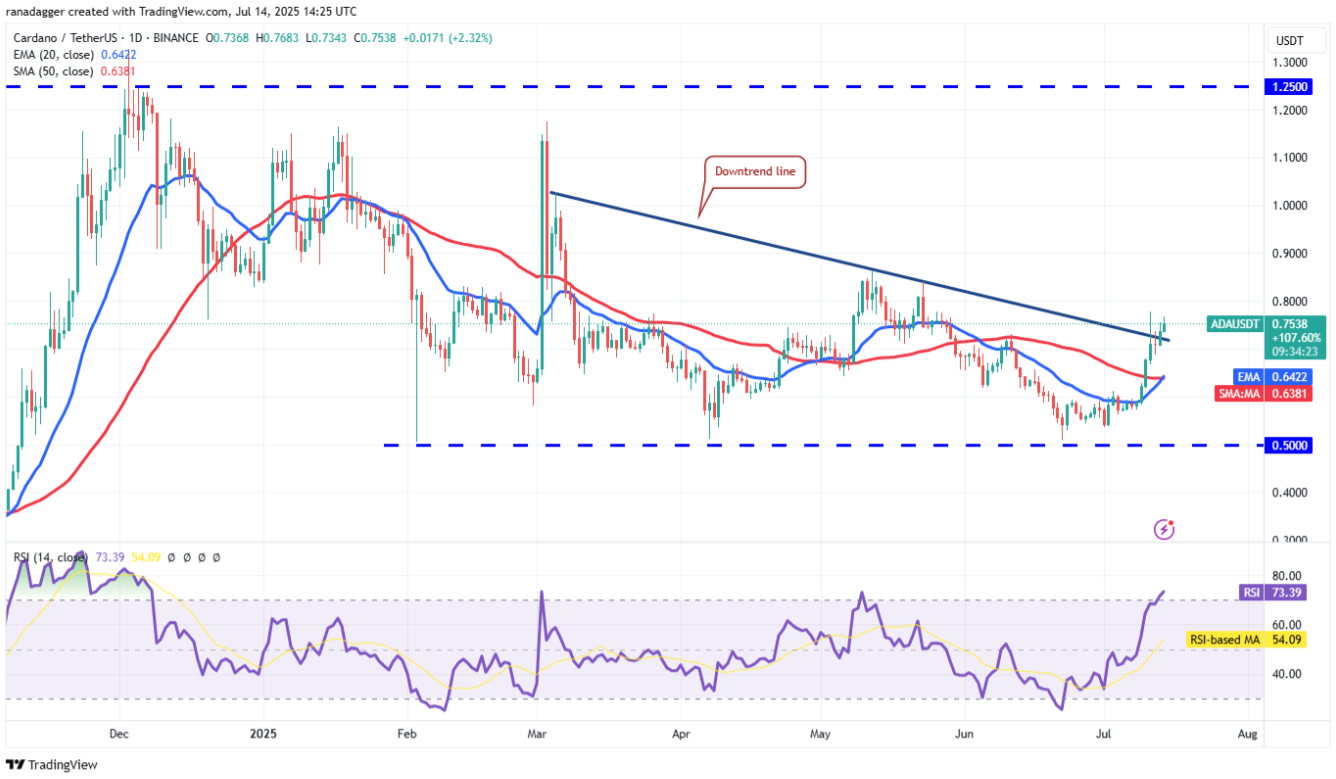 日曜日の終値は下行トレンドラインを上回り、弱気の下降トライアングルパターンが無効になりました。 ADA/USDT通貨ペアは0.86ドルまで上昇を続ける可能性があり、これが抵抗となる可能性があります。しかし、20日移動平均線(0.64ドル)は上向きに傾斜しており、RSIは過熱領域にあり、強気が優勢であることを示しています。終値が0.86ドルを上回ると、価格が1ドルに向かって進む可能性があります。