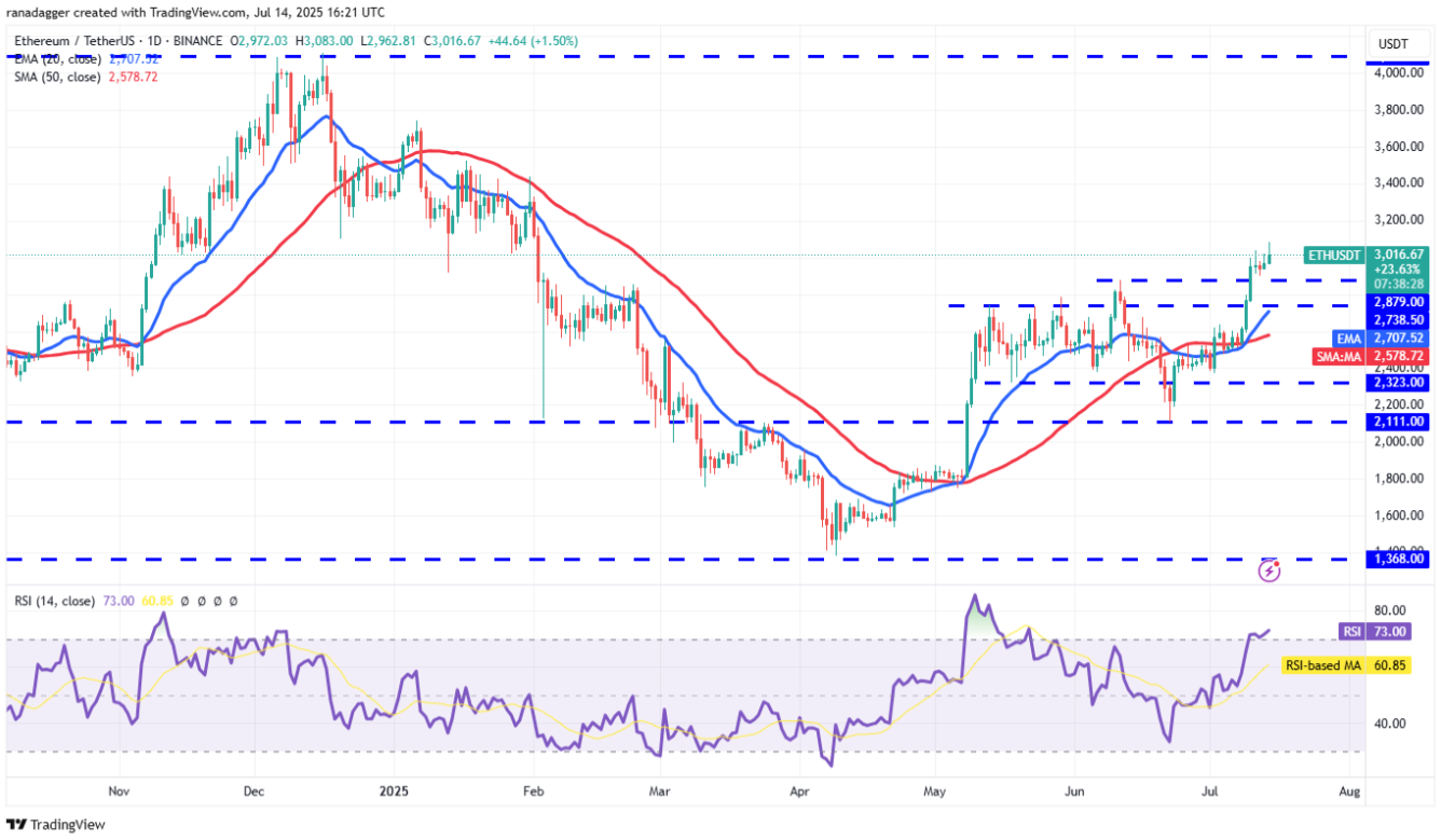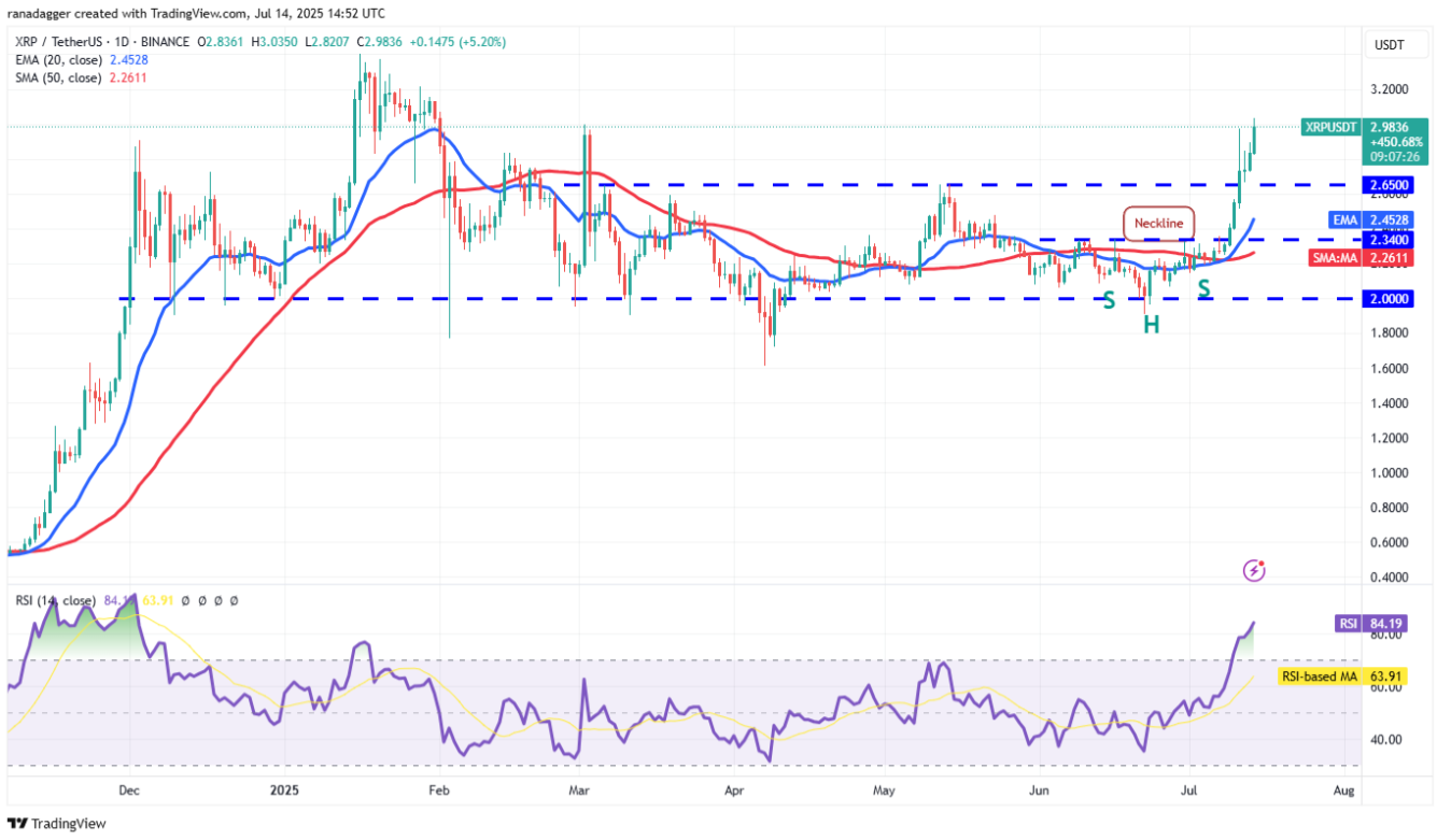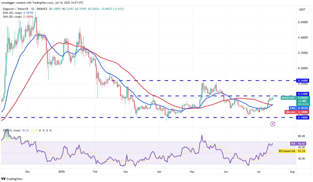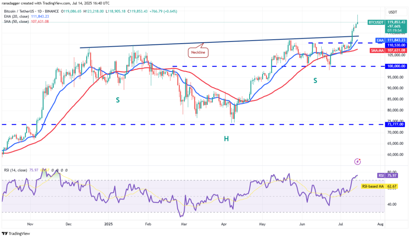 今回のプルバックは20日移動平均線(111,843ドル)でサポートを得ると予想されています。この場合、強気の勢いが依然として強いことを示しています。ブルは価格を123,218ドル以上に押し上げるために引き続き試み、次の上昇相場を開始し、目標は150,000ドルを指しています。
