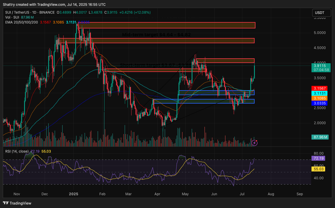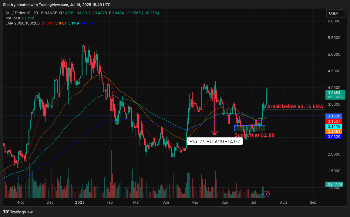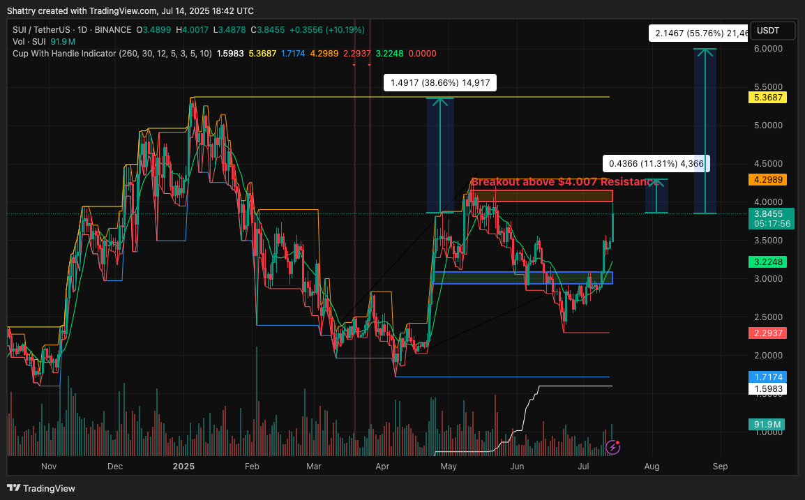 OpenAI の人工知能モデル ChatGPT は 42 のリアルタイム指標を処理し、ビットコインが歴史的な 123,000 ドルの最高値を更新した後に SUI(SUI)が 3.9091 ドルまで 12.01% 急騰したため、画期的な強気の勢いを示しています。VanEck と Lion Group の機関によるサポートが対称三角形の突破を後押ししました。