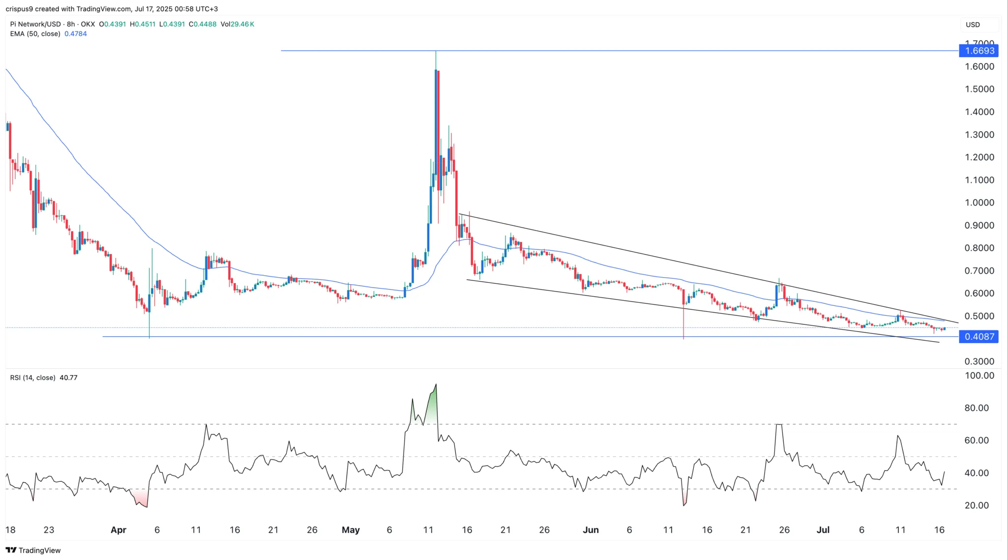 Pi 通貨の価格も下落楔形の形態を形成しており、これは一般的な強気の反転シグナルです。したがって、これらの形態が有効であれば、Pi 通貨の価格は大幅に反発するでしょう。