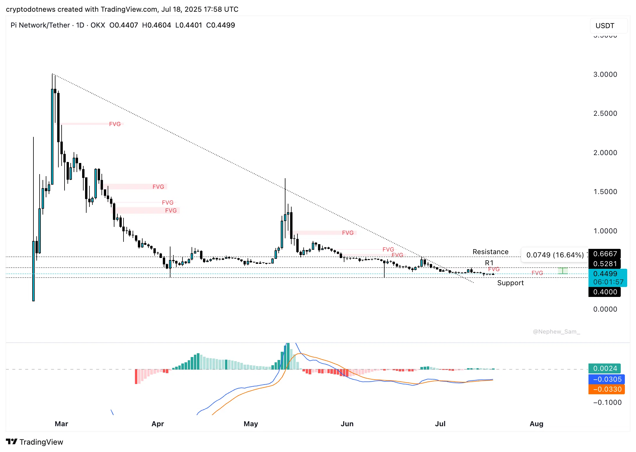 PI/USDTの日足チャートを見ると、PIは現在の取引価格が0.44ドルを上回っています。