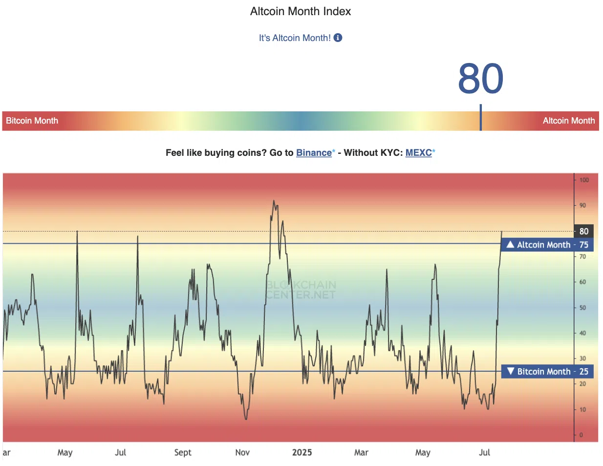 この指数はアルトシーズンがまだ醸成中であることを示しています。しかし、月間の時間範囲内では、この値は0から100の範囲で80であり、これは「アルト月」であることを意味します。