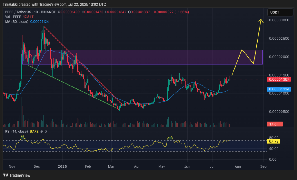現在のPEPEの価格は約0.00001387ドルで、過去7日間で38%、過去1か月で53%上昇しましたが、2024年末のピーク値0.00002803ドルより約50.44%低いです。今年第一四半期、PEPEは下降ウェッジパターンを形成しました。このテクニカルパターンは、通常、間もなくブレイクアウトが起こることを示唆しています。