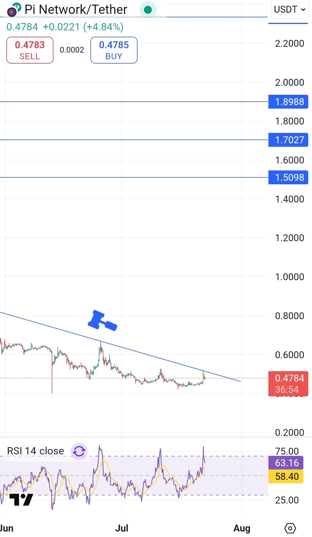 チャート観察者は、PI/USDTチャート上に下降ウェッジが形成されていることを発見しました。これは通常、強気の形態であり、出来高のサポートがあれば迅速に突破できます。現在、価格はウェッジの上部をテストしており、0.52ドルに近づいています。
