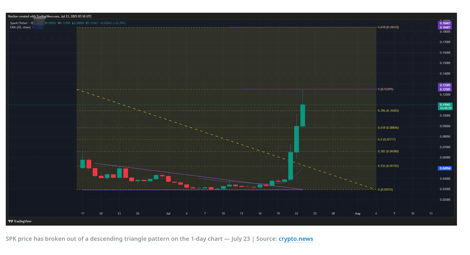 テクニカル分析:下降三角形の強気ブレイク確立 日足チャートでは、SPK価格が下降三角形の上辺を成功裏に突破しました。 下降トライアングルは通常、徐々に低下する高点と水平な底部サポートラインで構成され、伝統的に弱気の継続パターンと見なされます。しかし、価格がこのパターンの上辺界を上に突破する場合、トレンドの反転を示唆する可能性があり、買い手が状況を掌握し、価格を上昇させることを促進します。 上の図に示すように、SPKの価格はこの形状の上方トレンドラインを有効に突破し、強気の反転シグナルを確認しました。 さらに、トークンの価格は20日指数移動平均線(20-day EMA)(0.050ドルに位置)を成功裏に回復し、この移動平均線は現在動的サポートレベルに転換しています。