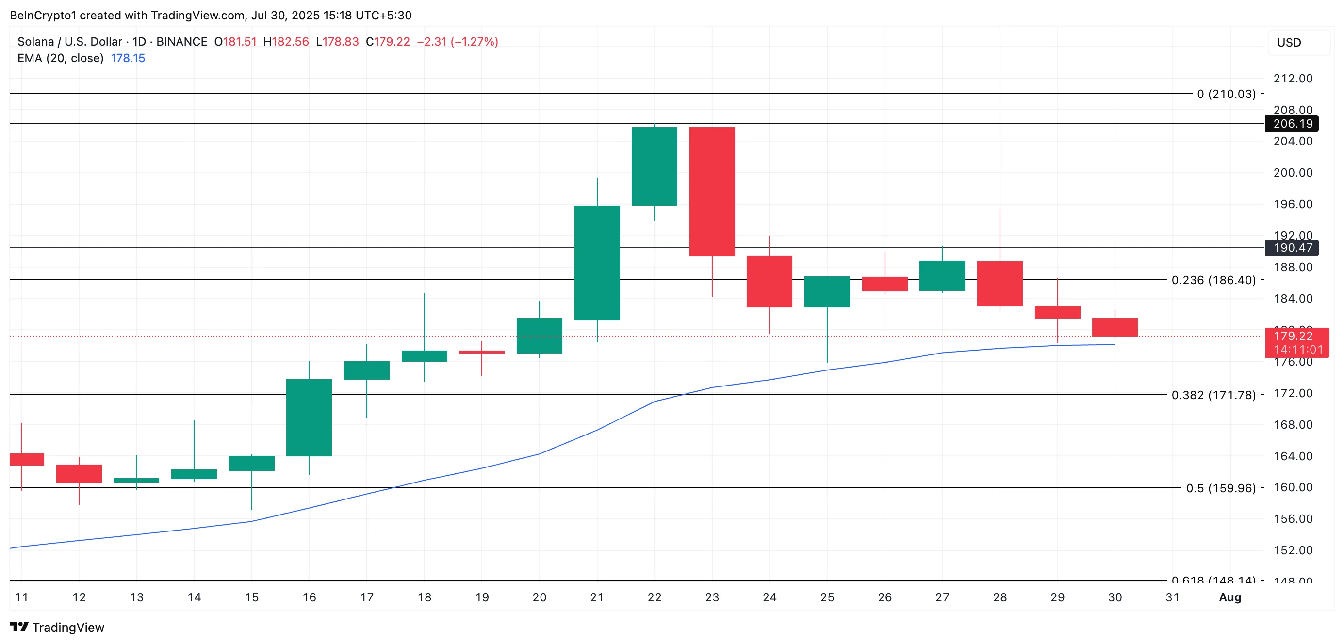SOLは過去数日間の下落により、その価格を危険なほど20日指数移動平均線(EMA)に近づけており、このラインは178.25ドルで重要な動的サポートラインを形成しています。現状では、SOLの取引価格は180.51ドルです。