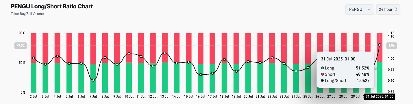 その比率が1を超えると、ロングポジションを持つトレーダーがショートポジションを持つトレーダーよりも多いことを意味します。ペンギに関しては、市場参加者が価格が引き続き上昇することにますます賭けていることを示しています。