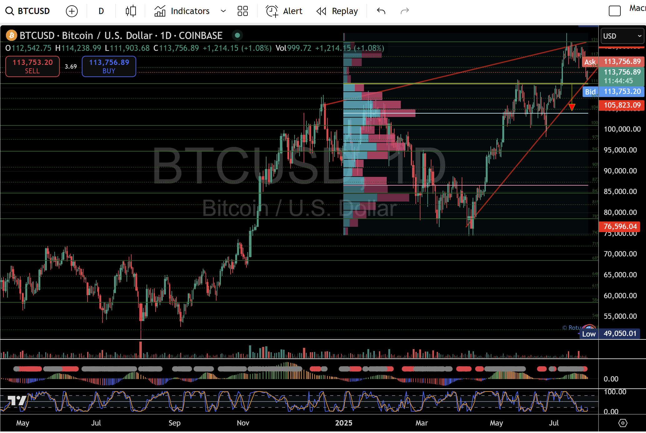 7月、ビットコインは121,000ドルの抵抗線で停滞した後、下落トレンドラインと年初の価値域高点(VAH)をテストしました。このポイントは現在、111,000ドル前後であり、非常に重要な意味を持っています。