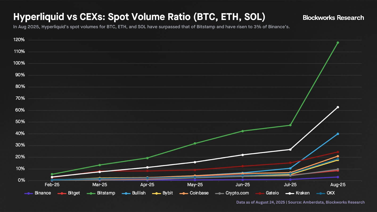 Blockworks の研究員 Carlos は、Hyperliquid が過去 30 日間で約 1 億ドルの収益を上げ、複数の成熟した第 1 層のパブリックチェーンを超えたと指摘しています。今月、同プラットフォームのビットコイン(BTC)、イーサリアム(ETH)、およびソラナ(SOL)の現物出来高は、他の CEX の水準に達するか、それを超えています。